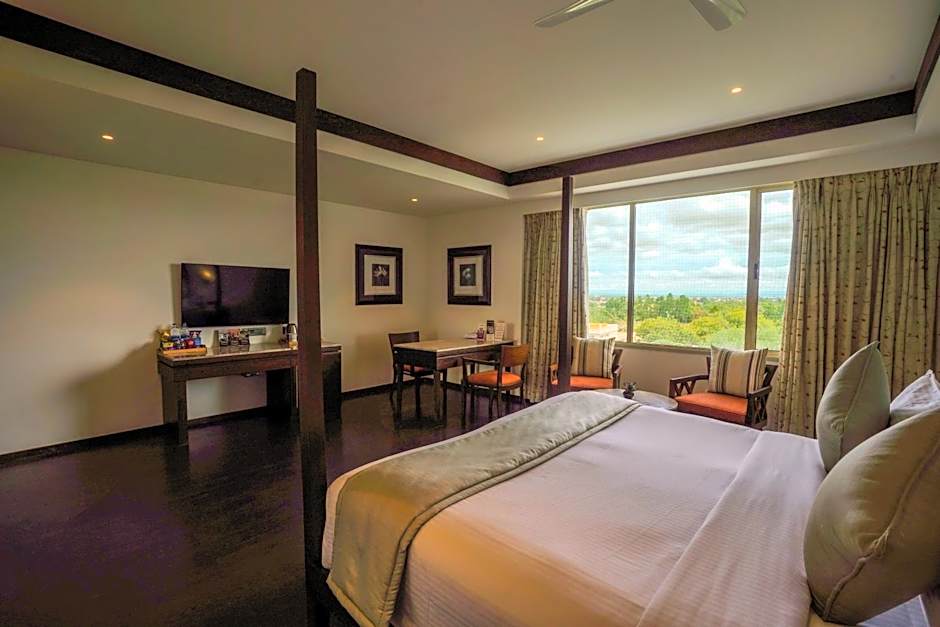 Spacious room features classic interiors and views of surrounding hills and the pool.